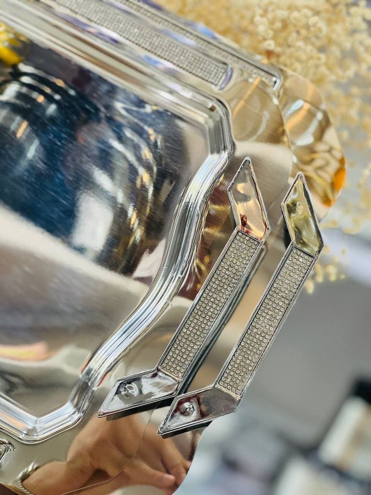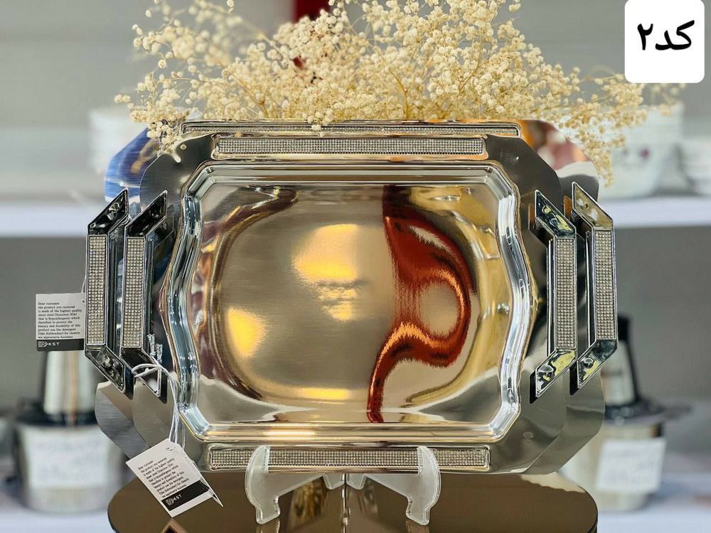 سینی استیل جفتی نگین دار آیینه ای استیل ضخیم ۱۸/۱۰ ابعاد صفحه کوچیک ۳۵×۲۶ سایز با دسته ۳۸ ابعاد صفحه بزرگ ۴۳×۳۱ سایز با دسته ۴۵ دسته مقاوم زاماک دارای جعبه کادویی خیلی زیبا
